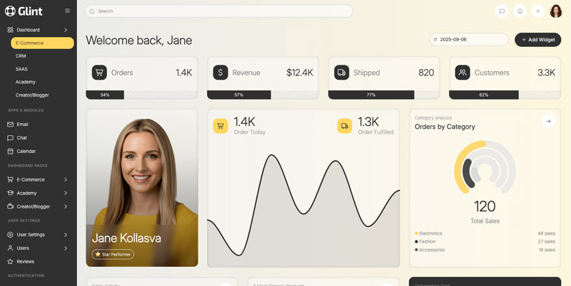 Glint is a modern, new Glass-Inspired UI Design, responsive, and premium React + Vite + Bootstrap 5 Admin & Dashboard Template. Whether youβre building a Web App, Dashboard, Admin Panel, SaaS platform, CRM, eCommerce, Academy, or Creator/Blogger interface, Glint provides everything you need with a fresh glass-inspired design that stands out from the rest.